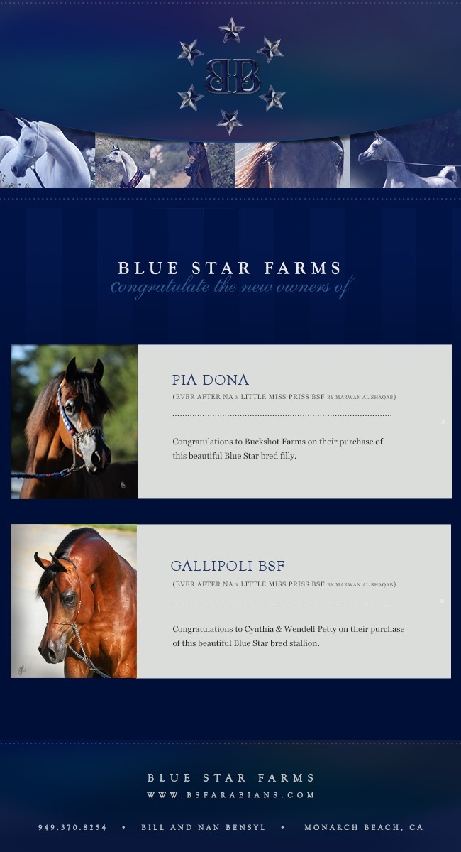 Gallipoli BSF (Ever After NA x Little Miss Priss BSF) We wish great success to Cynthia and Wendell with this purchase of this ‘Blue Star’ bred stallion.