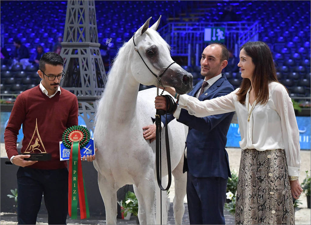 The Senior Male Championship was particularly special as the three chosen for medals are dearly loved by the community with passionately devoted fanbases; all capable of winning; and entirely different from one another in both genotype and phenotype. Also, although there was not a unanimous champion, there was consistency in placement between the Qualifying Classes and the Championships as the medal winners competed together in the same Qualifying Class with the same final line up. It is fair to write, Equator’s time for the Paris spotlight had finally arrived as he earned the title of World Senior Male Gold Champion—to the absolute thrill of his fiercely loyal admirers. Equator (QR Marc X Ekliptyka), a 2010 stallion who was bred by Stadnina Koni Michalow SP (POL) and is owned by Al Sheikh Stud (ISR), tied with Yearling Admiraal for the highest average Qualifying Class Score and was awarded eight 20’s: four for TYPE and four for MOVEMENT. He was also the 2018 European Senior Stallion Gold Champion. The Silver was earned by E.S. Harir (AJ Dinar X TF Magnum’s Magic), a 2011 stallion who was bred by Emirates Stud (UAE) and owned by Alsaqran Stud (KWT). E.S. Harir was awarded seven 20’s: five for TYPE and two for HEAD & NECK and received the second highest score for TYPE in the show. He was also the 2018 unanimous ANC Senior Stallion Gold Champion. Finally, the Bronze was earned by the most senior of all medal winners, Al Ayal AA (Al Ayad X The Vision HG), a 2008 stallion who bred and owned by Ariela Arabians (ISR). With straight 20’s for TYPE, Al Ayal AA earned the highest score for this category of the show. He was also awarded the second highest amount of 20’s of the show with the additional three being for HEAD & NECK. Other Senior Stallions chosen for medals included: E.S. Sarab, PSE Al Rakhan (Bronze European Champion) and Al Khatab Al Thani.
